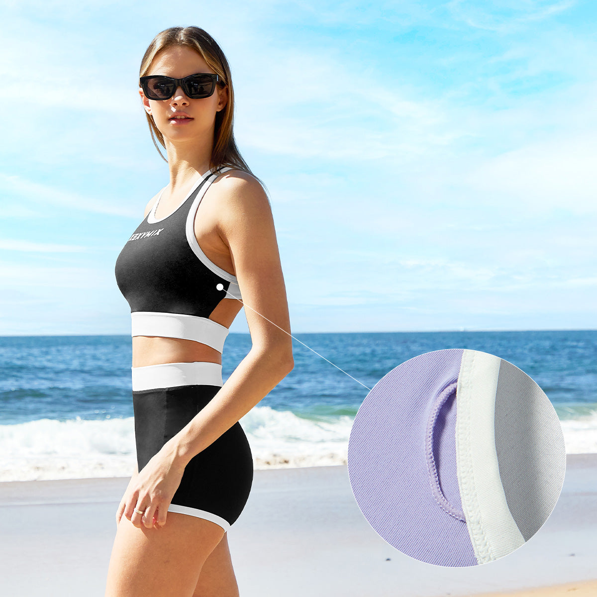 The two-stage strap provides firm support to the body. And the color block applied to the neck, armhole line, and band adds a point and creates a sporty mood.