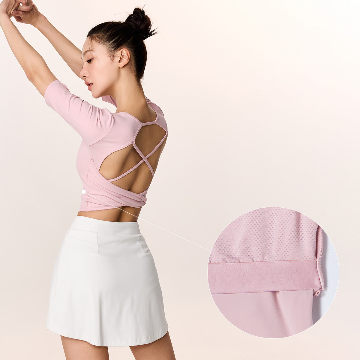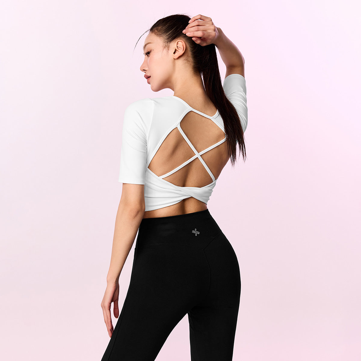 The X-strap back design allows for free movement while providing a secure fit that stays in place, and the twisted waist detail adds a feminine touch.