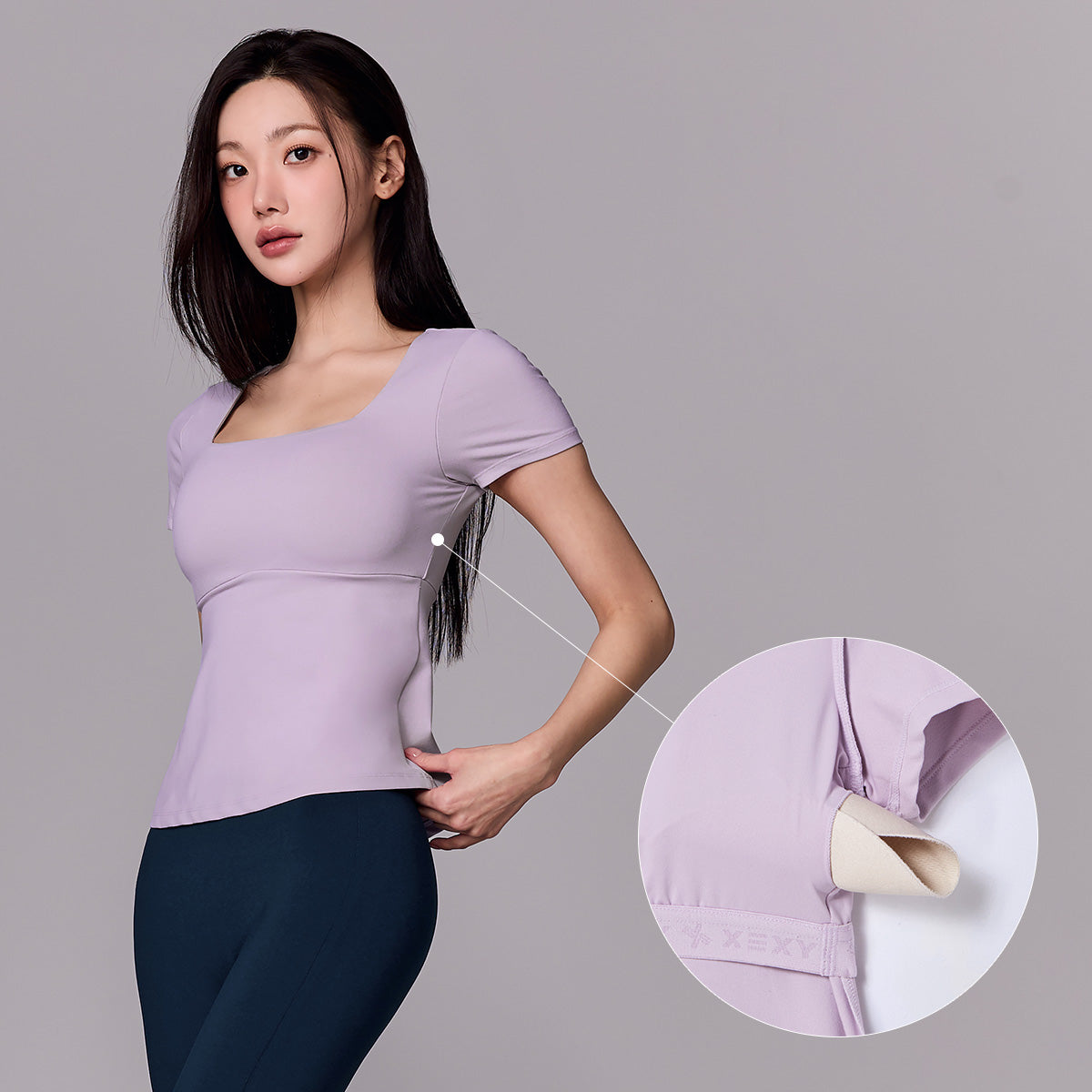 A soft wool band is applied along the under-bust lining, providing a secure fit without chafing or rolling up—even during active movement.