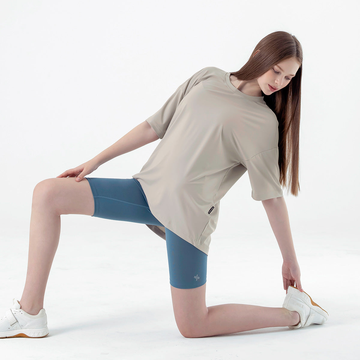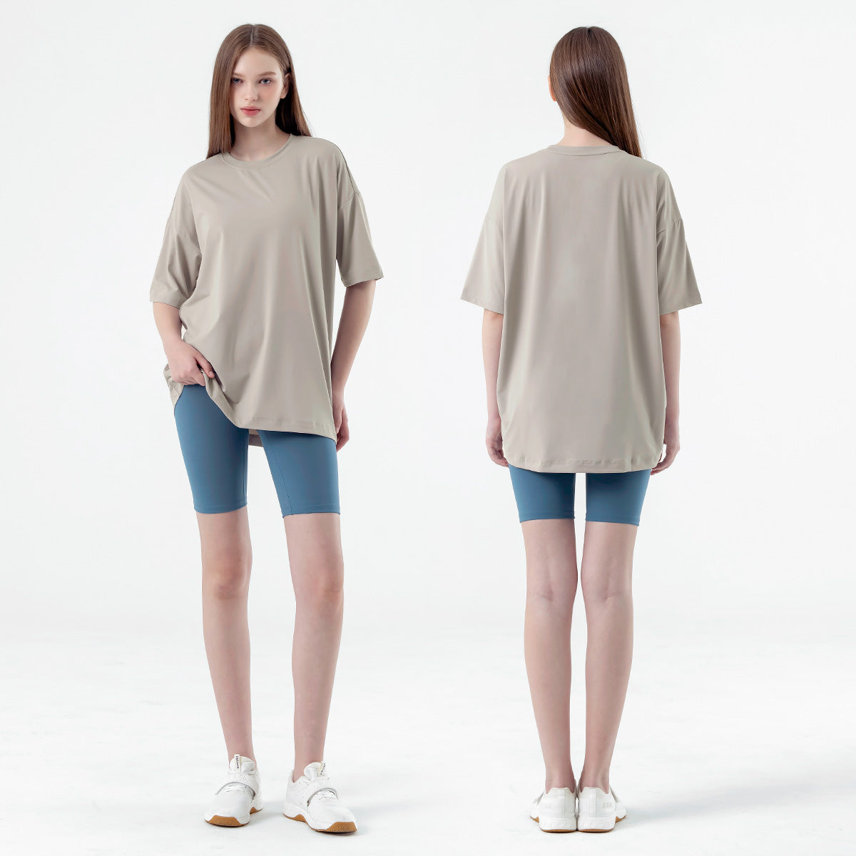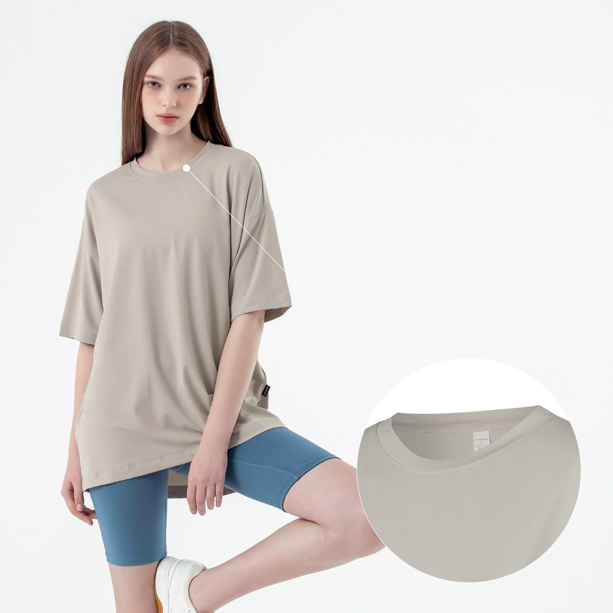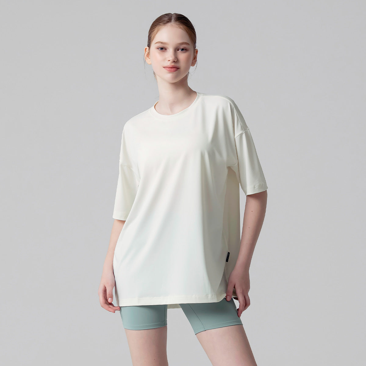 If you usually feel uncomfortable wearing leggings alone, try wearing them with the Ice Feather Overfit T-shirt. It will complete the burden-free leggings styling.